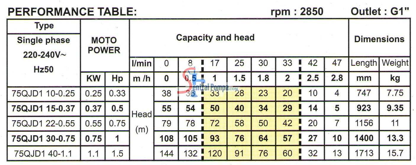 Pompa Submersible 3 Inch 1 HP 75 QJD1 30-0.75 | SENTRAL POMPA - solusi pompa air rumah dan bisnis anda